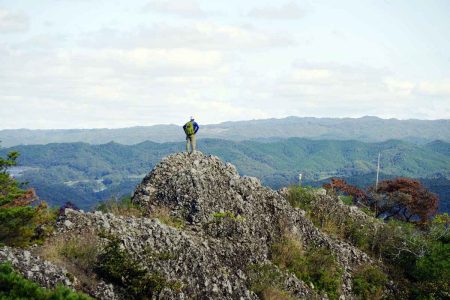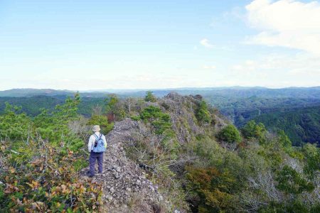The best part of Namase Fuji starts here. Swing around the massive boulder on the mountain’s north side, and a rocky ridgeline awaits. One especially striking, dome-shaped rock is said to resemble the Grand Gendarme on the Eiger in the Swiss Alps, earning it the nickname “the Ibaraki Gendarme.” Walk the ridgeline carefully and climb up onto the gendarme rock for a 360-degree panoramic view.