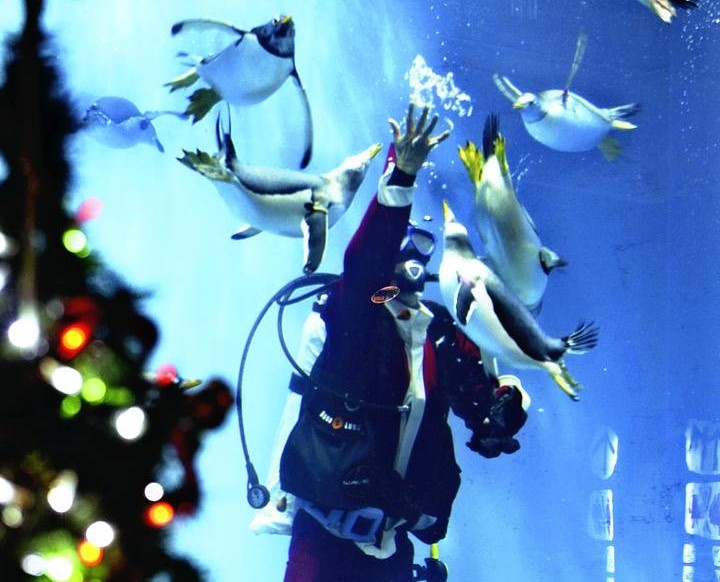 A keeper dressed as Santa is seen taking out food in the penguin’s tank.