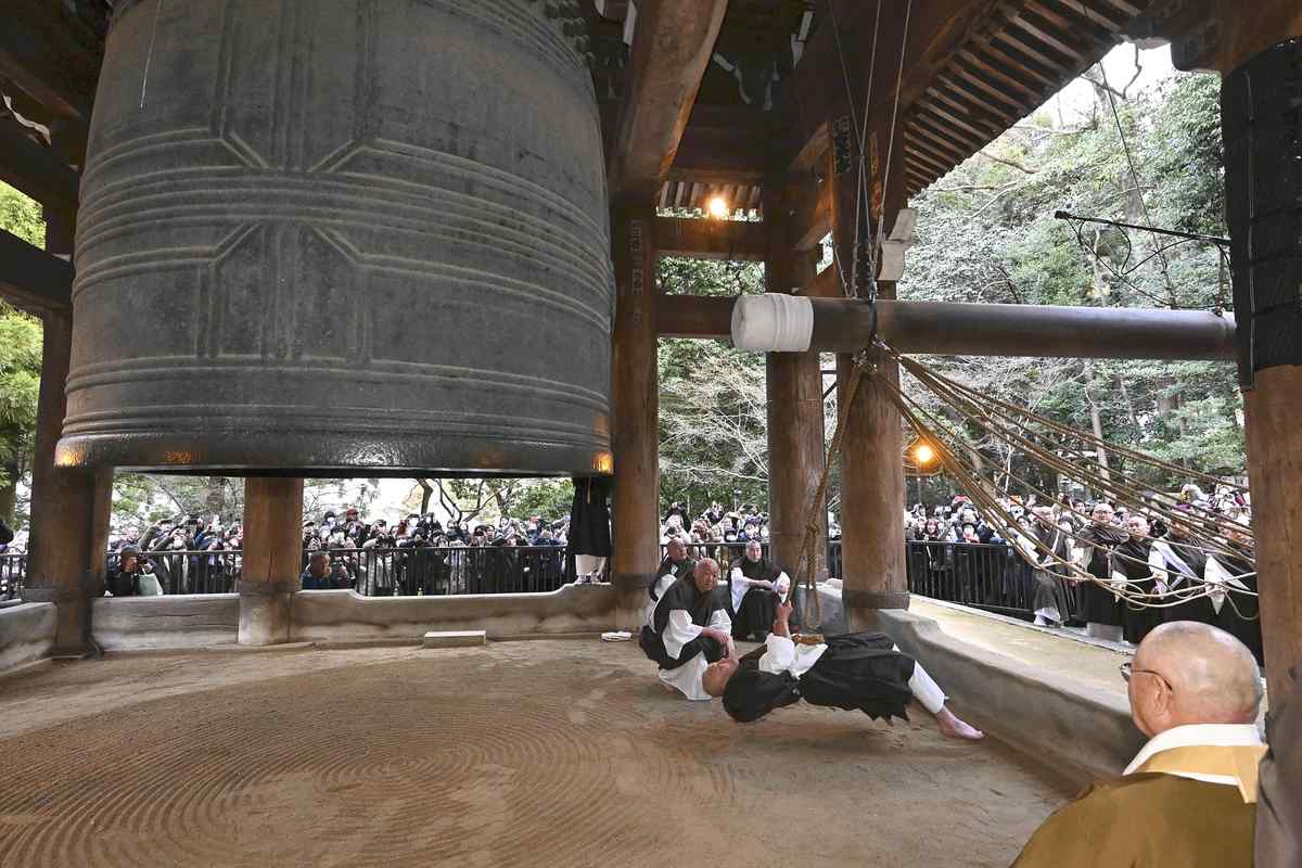 A Buddhist monk in a horizontal position strikes a bell with all his might at Chion-in temple in Kyoto on Saturday, ahead of New Year’s Eve. In Japan, bells are struck at temples from Dec. 31 to Jan. 1 to ward off evil desires in the new year ahead. Holding a rope tied to a log, the monk put his entire body weight into striking the bell, letting out shouts as he did. The temple’s bell was cast in 1636 and weighs about 70 tons. It is said to be one of the three best temple bells in Japan.