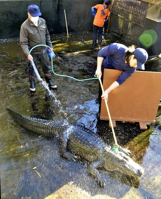 SHIZUOKA – Crocodiles and alligators were recently scrubbed with deck brushes by keepers at Atagawa Tropical and Alligator Garden in Higashi-Izu, Shizuoka Prefecture, as part of the facility’s annual year-end cleanup.