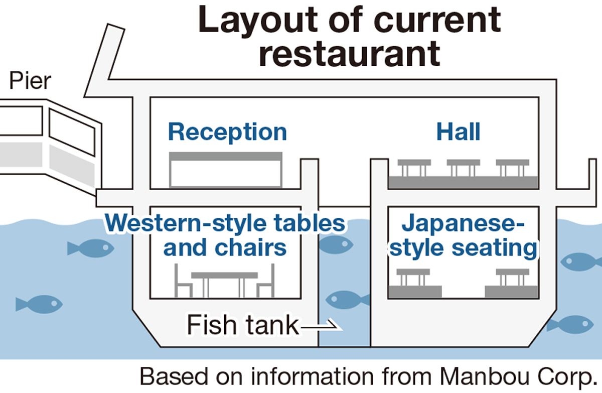 KARATSU, Saga — An underwater restaurant in the Yobuko district in Karatsu, Saga Prefecture — known for its Yobuko squid — will get a new vessel as early as this summer. The restaurant is popular because diners can enjoy eating seafood while looking through windows at fish swimming in the sea.