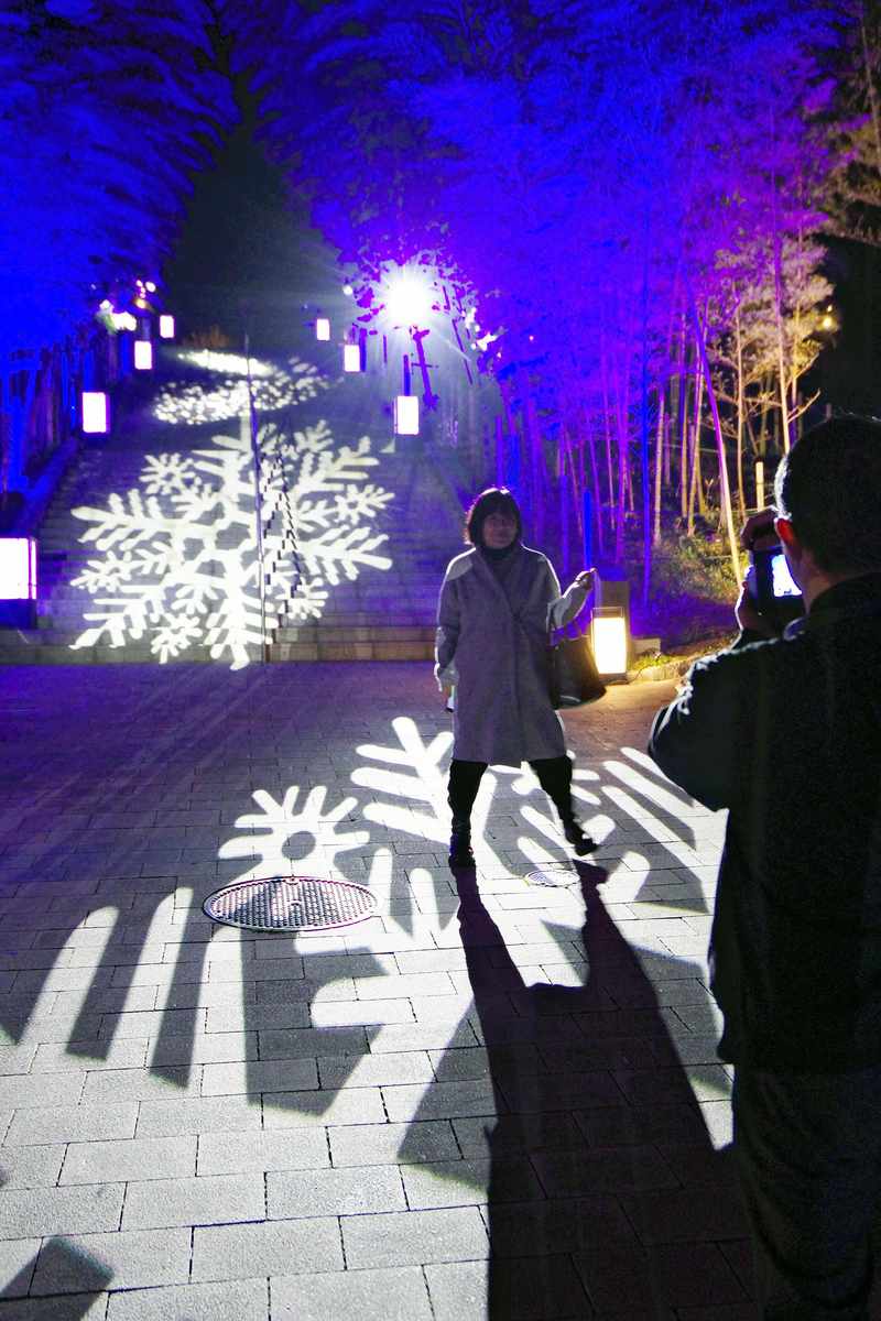 For the light show synchronized with a narration of one of her works, “Yuki” (Snow), large snowflakes appeared on the stairs leading down to the riverbank, illuminated by lights evoking a blue sky.