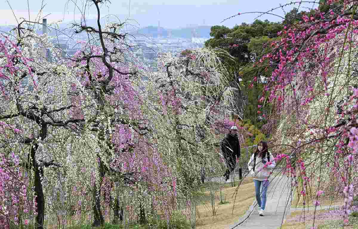 Weeping plum trees are in full bloom in the plum garden at Mimuroto Temple in Uji, Kyoto Prefecture. The garden, which was developed in 2021, has approximately 250 plum trees with red, white and pink varieties planted in the grounds. The garden’s hillside location lets visitors to enjoy the view which overlooks the city. Due to the recent warm weather, the trees reached full bloom about 10 days earlier than usual.