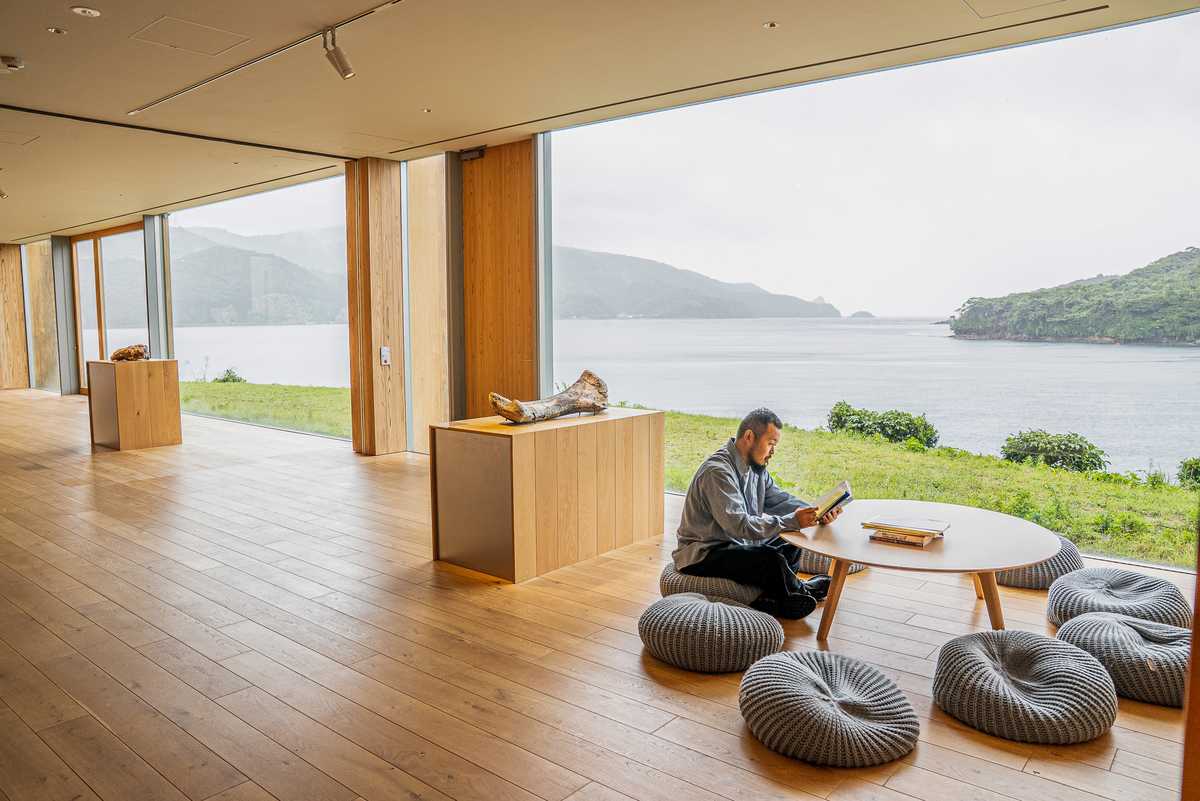 Shiitake Creative cofounder Seiya Hongo reads in the Geo Lounge at the Ento accommodation facility in Ama, Shimane Prefecture.
