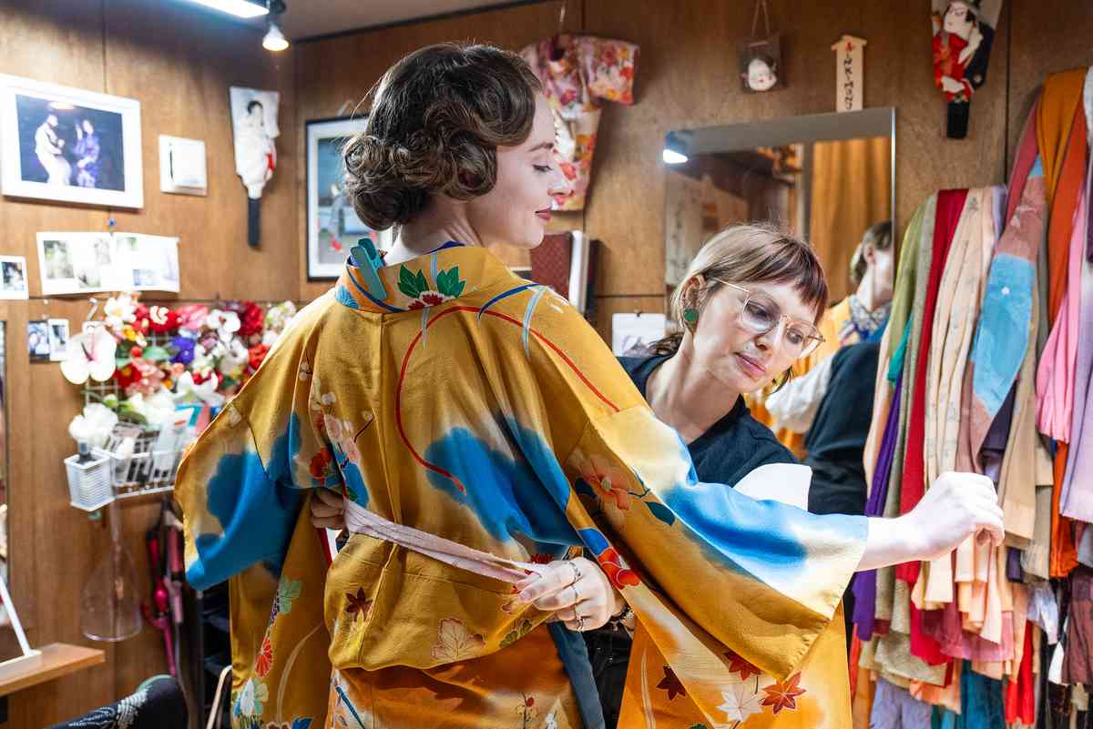 Stasia Matsumoto, right, dresses a client at her InKimono studio in Asakusa, Tokyo.