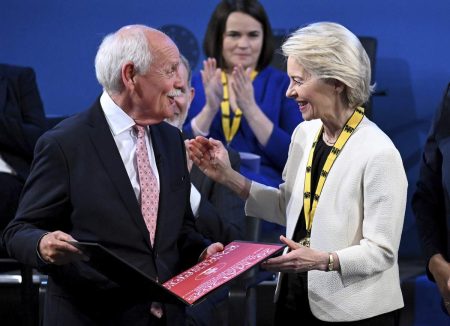 BERLIN (AP) — European Commission President Ursula von der Leyen received the International Charl...