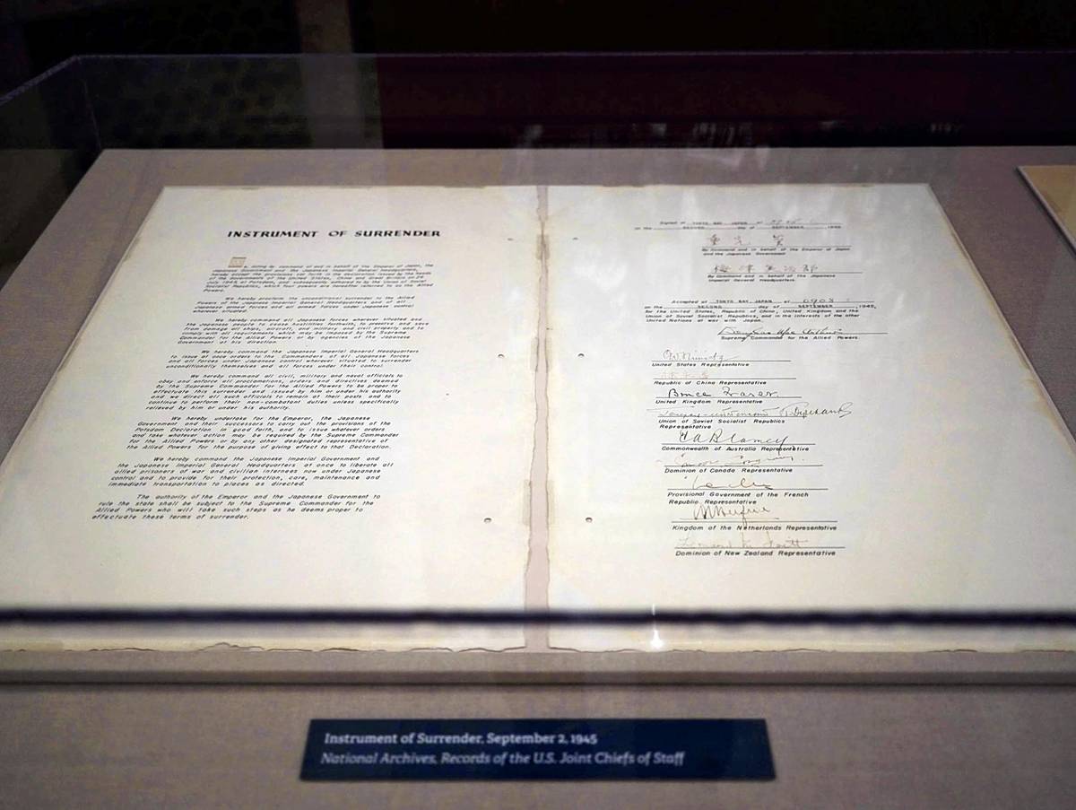 The instrument was signed on Sept. 2, 1945, aboard the USS Missouri battleship anchored at Tokyo Bay by then Japanese Foreign Minister Mamoru Shigemitsu, Gen. Douglas MacArthur, supreme commander of the Allied Powers, and others.. It will be on display until Oct. 1.