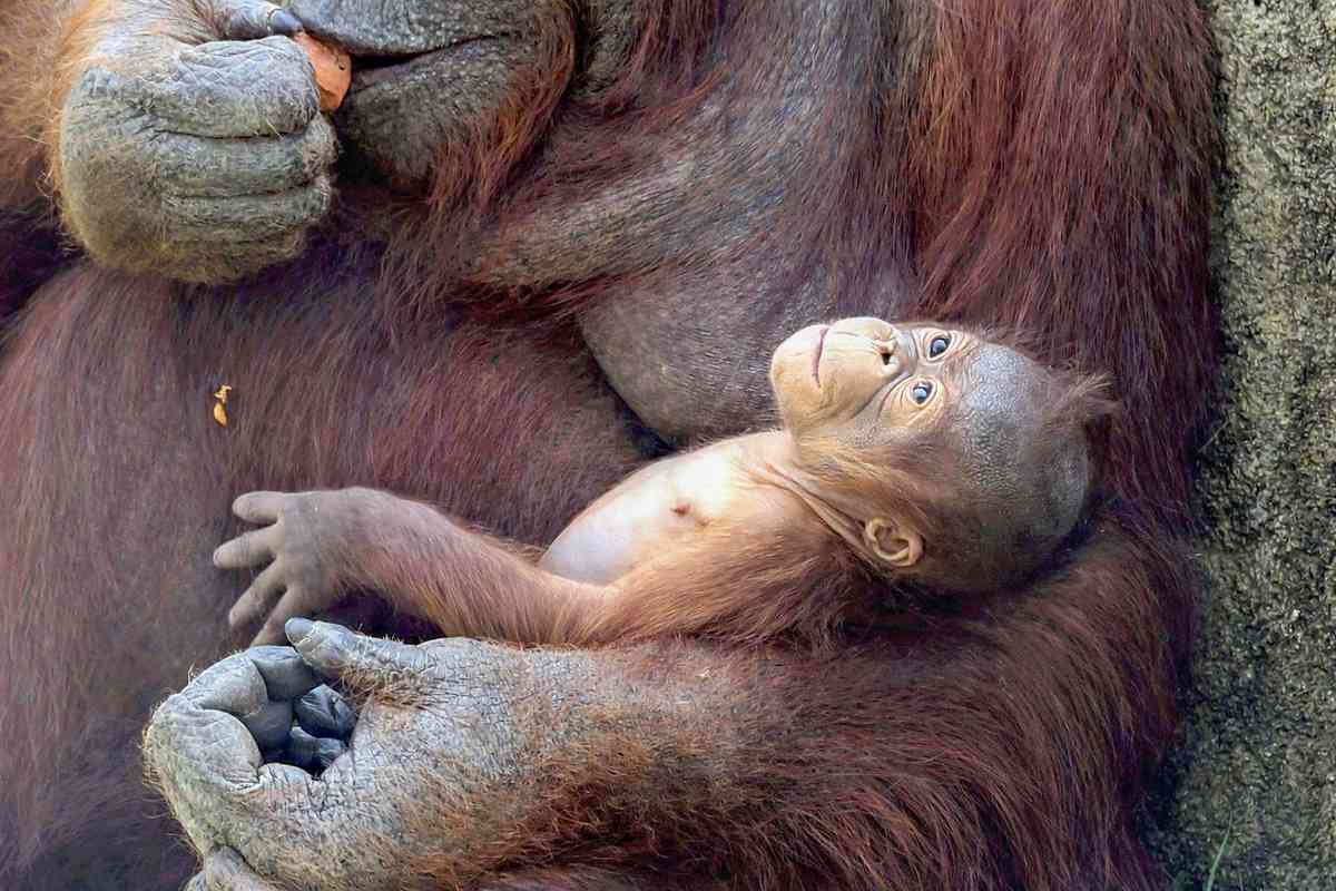 A photo shows Surya, a female Bornean orangutan, cradling her newborn shortly after its birth on April 2 at the Madrid Zoo Aquarium, in Madrid. This photo was released on April 14.