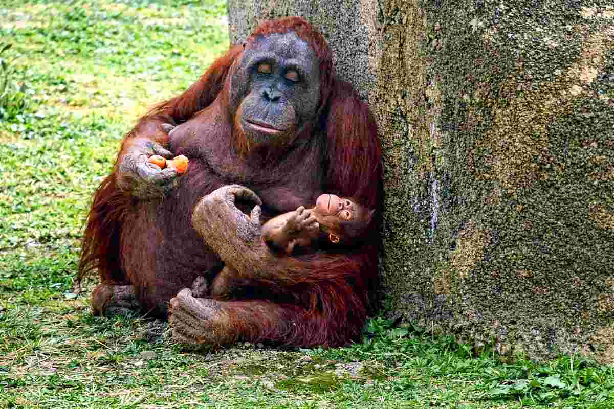 Orangutans usually give birth to a single baby or occasionally twins. They give birth, at the most, once every six years, and the interval between babies can be as long as 10 years.