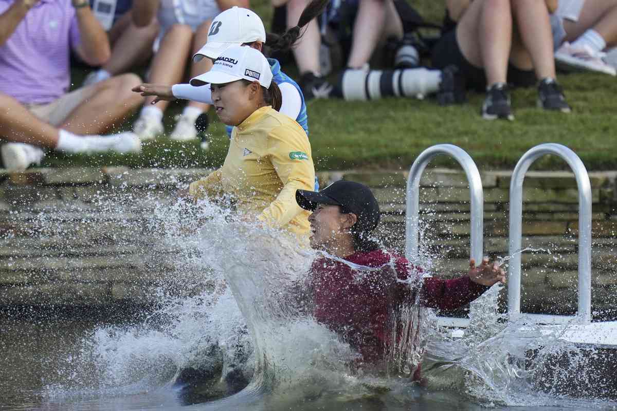 Winners had been jumping into Poppie’s Pond off the 18th green at Mission Hills since 1988, and Saigo became the third to do it in Texas by leaping into the brown-tinged water. She shrieked and smiled as she went in holding hands with two members of her team.