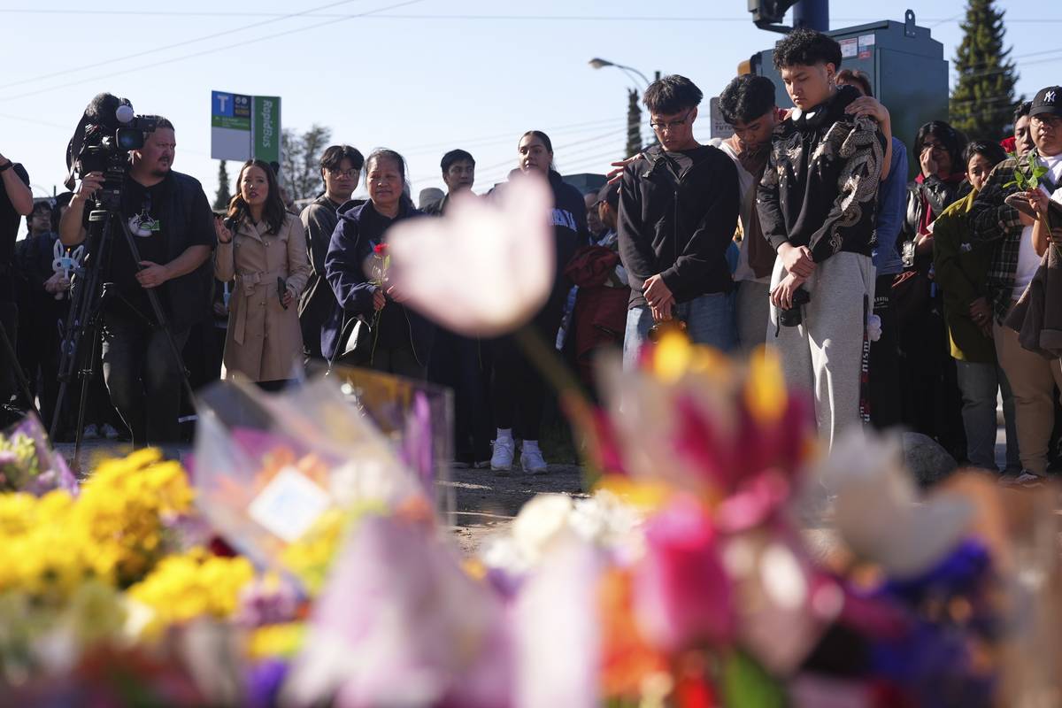 People visit a memorial after a vehicle drove into a crowd during a Filipino heritage festival in Vancouver, British Columbia, Sunday, April 27, 2025.