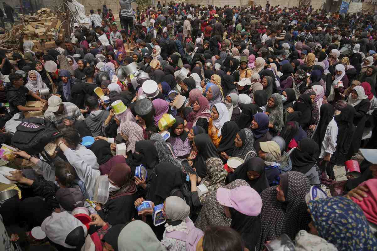 Palestinians struggle in a crowd as they try to receive donated food at a distribution center in Nuseirat, central Gaza Strip, Wednesday, April 30, 2025.