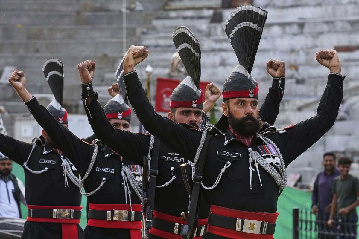 Pakistan’s Rangers soldiers gesture during a daily closing ceremony at the Wagah, a joint post on the Pakistan and India border, near Lahore, Pakistan, on Saturday.