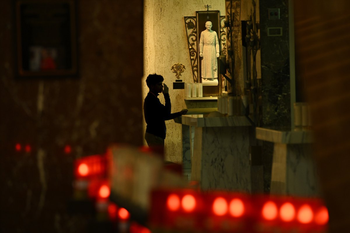 A St. Rita High School student prays in the school chapel where the new Pope Leo XIV, Chicago native Cardinal Robert Prevost, was a substitute teacher, Thursday, May 8, 2025, in Chicago.