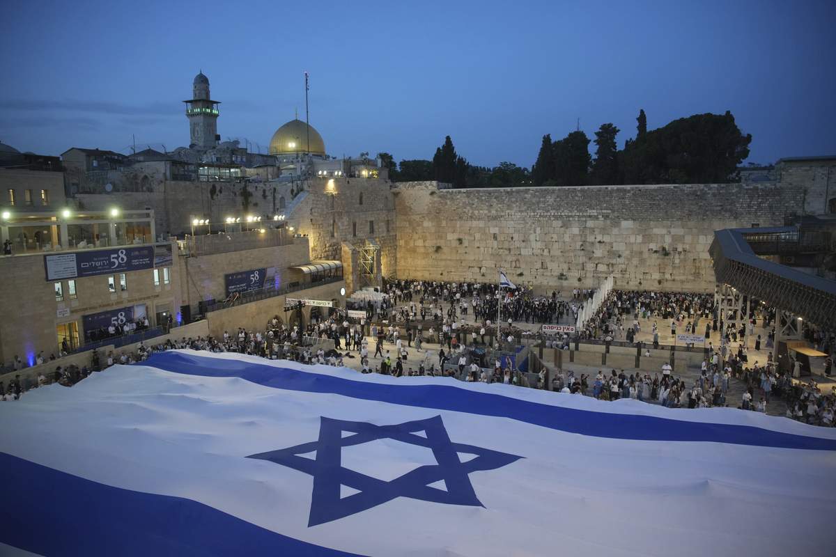 Members of Jewish youth movements unfurl a giant Israeli flag on the eve of Jerusalem Day an Israeli holiday celebrating the capture of the Old City during the 1967 Mideast war, next to the Western Wall in the Old City of Jerusalem, Sunday, May 25, 2025.