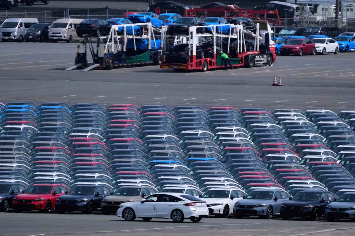 Workers, back, unload vehicles while a car, center front, is moved to another location of the area, where export vehicles are parked at the Daikoku vehicle terminal center in Yokohama, near Tokyo, April 8, 2025.