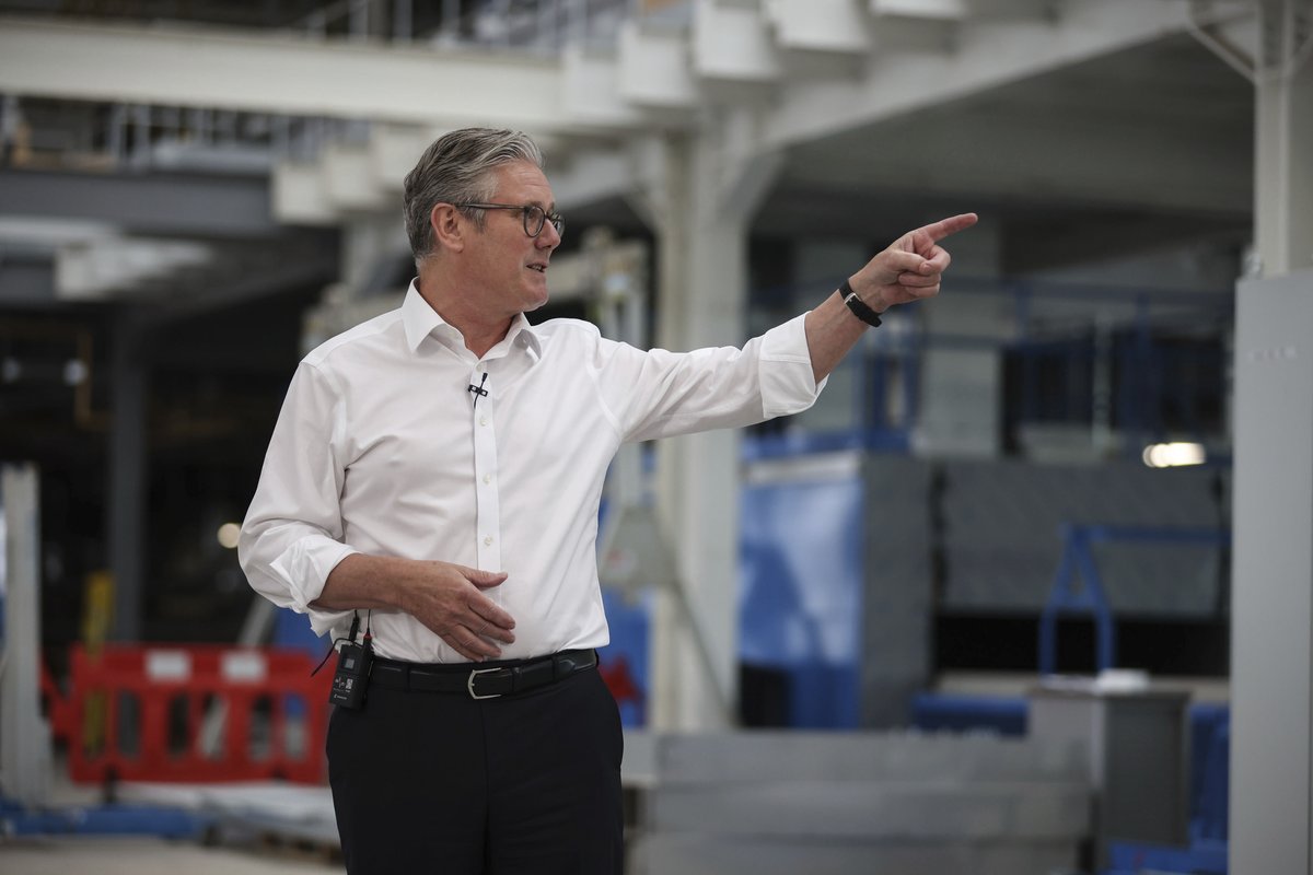 British Prime Minister Keir Starmer speaks to workers during a visit to Glass Futures in Saint Helens, Merseyside, England, Thursday May 29, 2025.