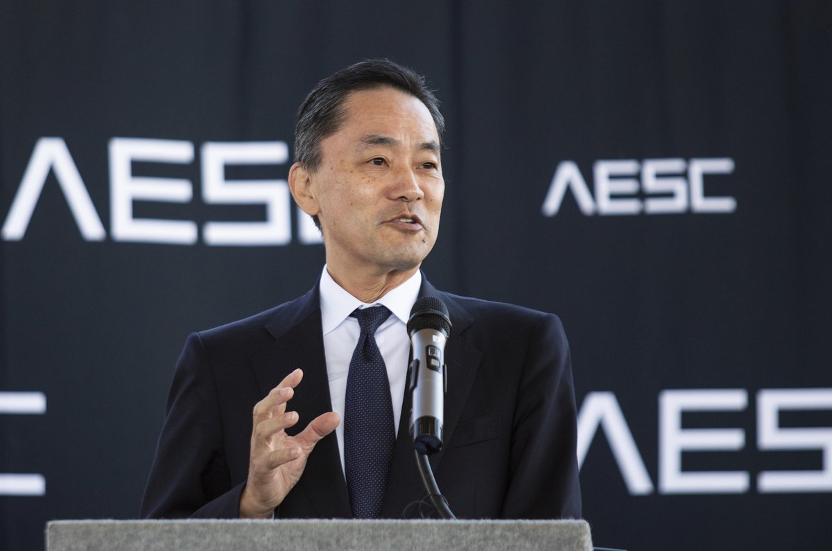 AESC Group CEO Shoichi Matsumoto speaks at the “Topping Out” structural completion milestone ceremony for the 1.6 million-square-foot AESC gigafactory being constructed in the Kentucky Transpark in Bowling Green, Ky., on Thursday, Sept. 14, 2023.