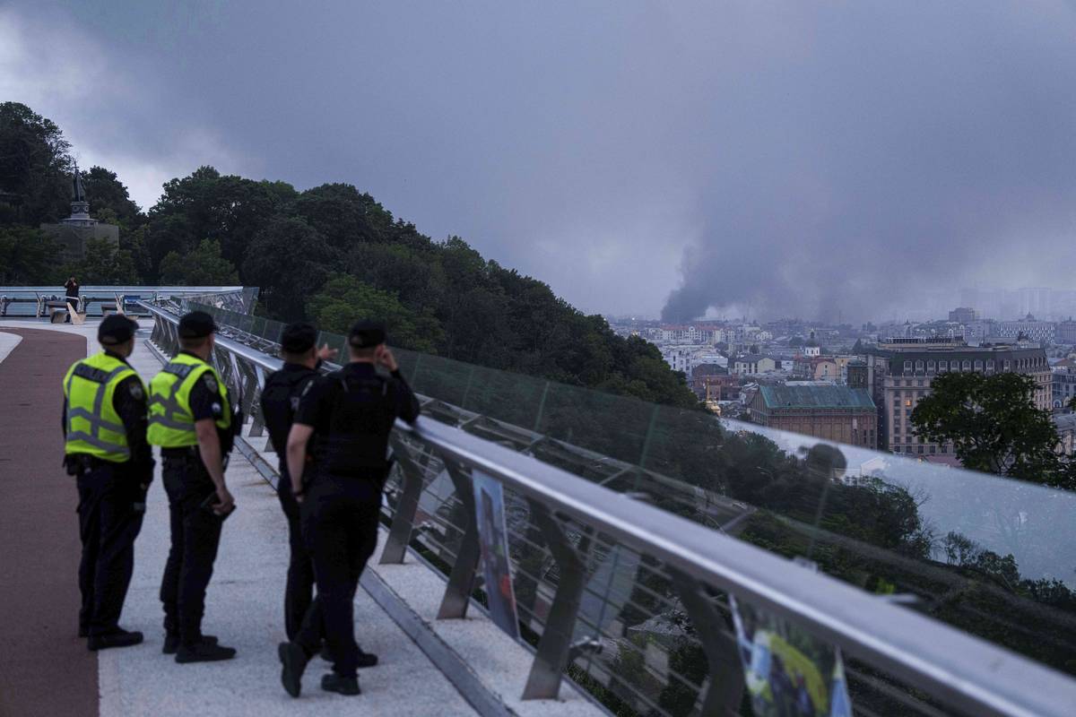 Smoke rises after Russian drone strike on Kyiv, Ukraine, Tuesday, June 10, 2025.