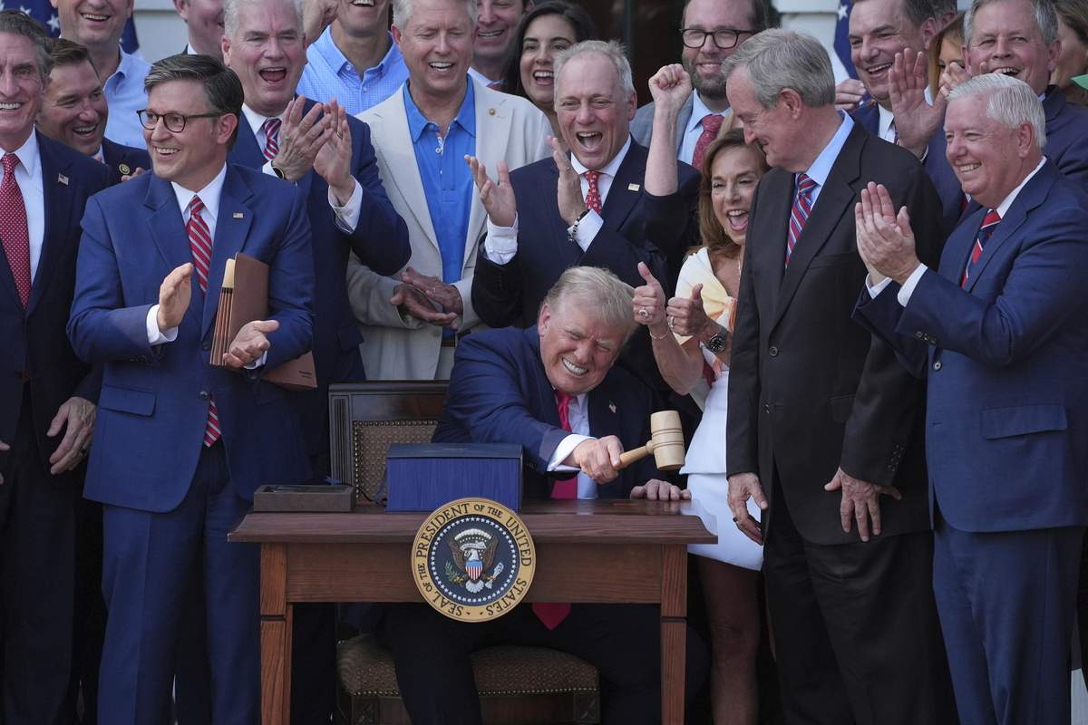 Flanked by Republican legislators and members of his Cabinet, Trump signed the multitrillion-dollar legislation at a desk on the White House driveway, then banged down a gavel gifted to him by House Speaker Mike Johnson that was used during the bill’s final passage Thursday.