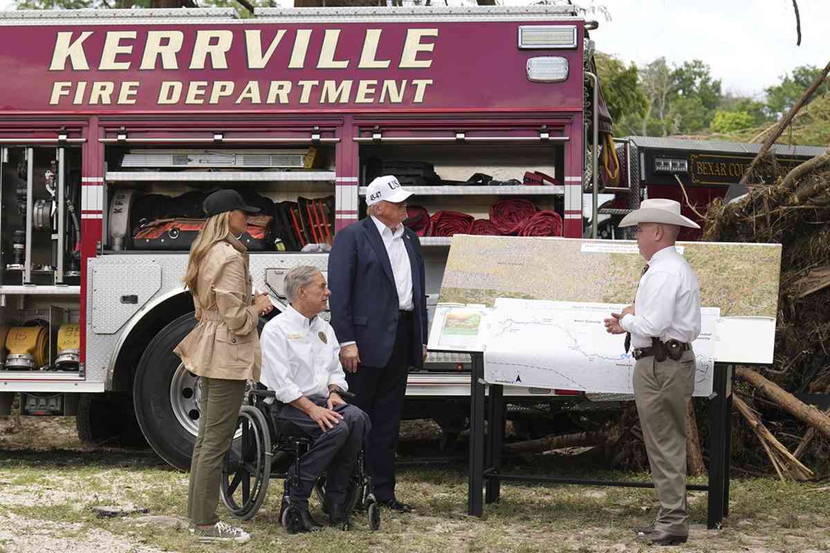 Prior to the roundtable, Air Force One landed in San Antonio and Trump deplaned in a suit while the first lady wore more casual clothing — though both wore ball caps against the heat. The Trumps then boarded a helicopter to Kerrville and saw the flooding aftermath from the air. They later walked close to the Guadalupe River to receive a briefing from officials near an overturned tractor trailer, numerous downed trees and other debris.