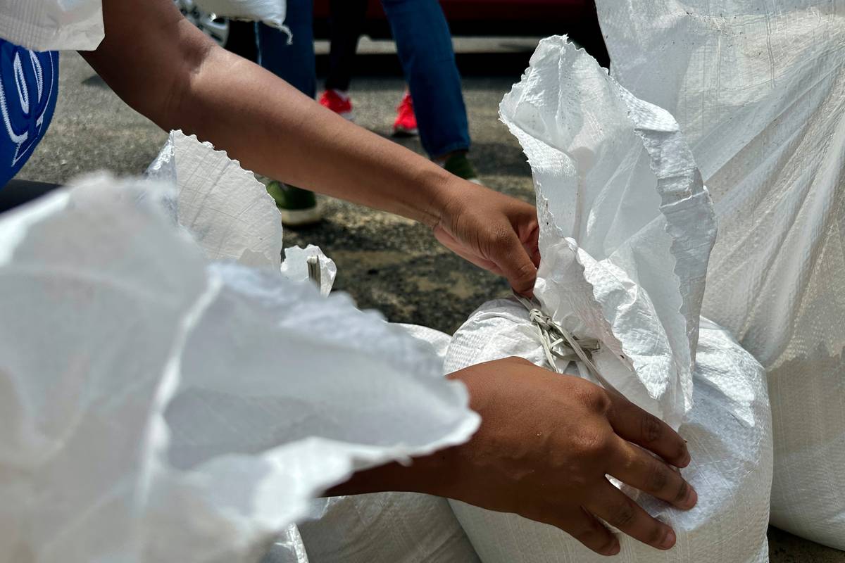 A volunteer ties a sandbag for New Orleans residents, Wednesday, July 16, 2025