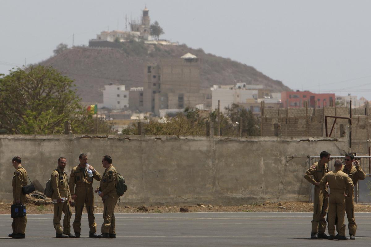 Members of a French military flight crew talk on the tarmac at France’s military air base in Dakar, Senegal, Tuesday, June 2, 2009.