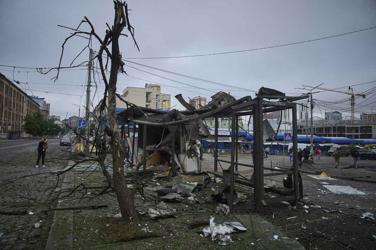 A bus stop is seen damaged by a Russian attack in Kyiv, Ukraine, Monday, July 21, 2025