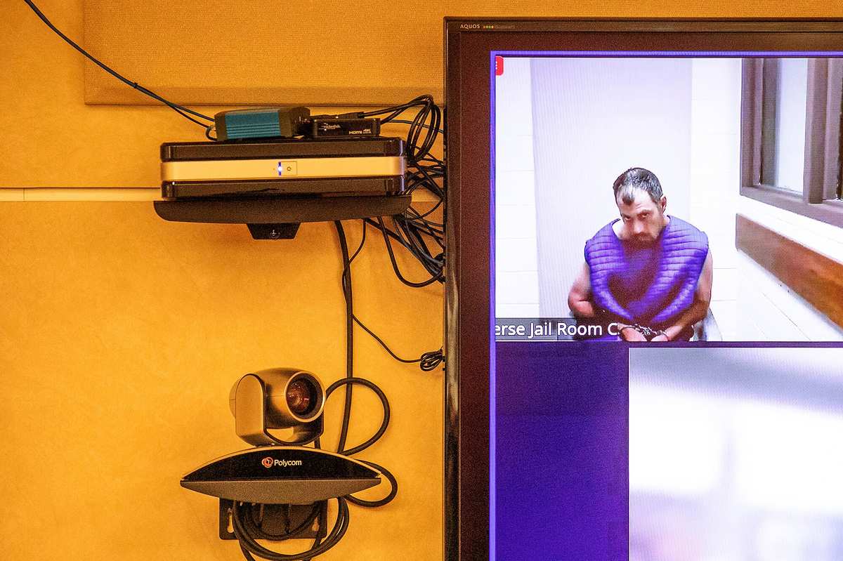 Bradford James Gille appears remotely in front of Chief Magistrate Tammi Rodgers, Monday, July 28, 2025, in Traverse City, Mich., on terrorism and assault with intent to murder charges in connection with stabbing attacks on Saturday at Walmart.
