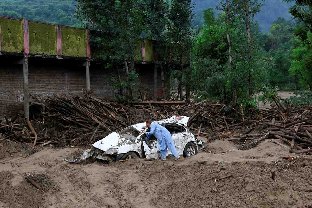 Gul Rasheed, 60, inspects a damaged car following a storm that caused heavy rains and flooding, in Bayshonai Kalay, Buner district, Khyber Pakhtunkhwa province, Pakistan, August 17, 2025.