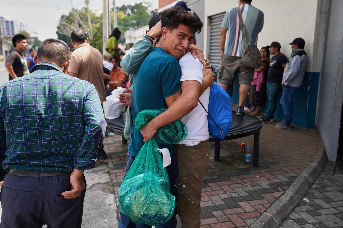 A Guatemalan migrant, in white, is embraced by an emotional relative after being deported from the United States, outside La Aurora International Airport, in Guatemala City, Sunday, Aug. 31, 2025.