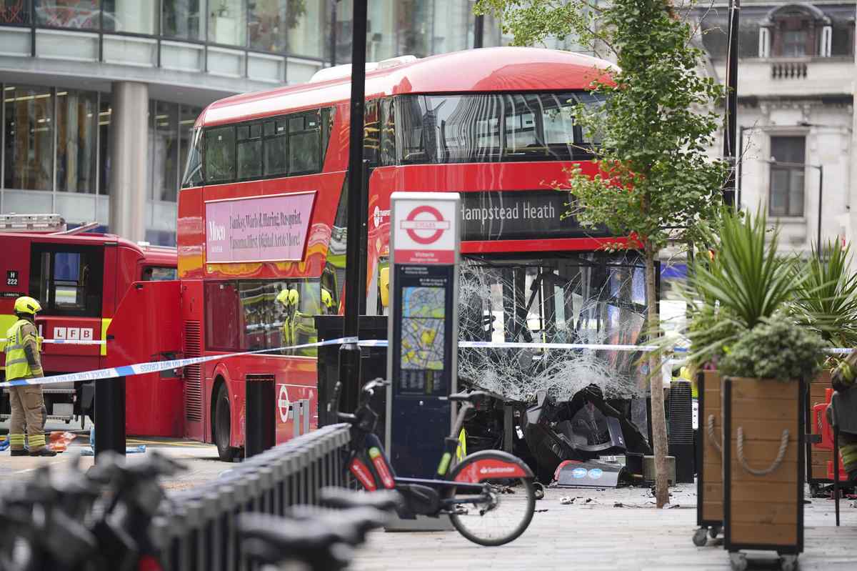 LONDON (AP) — Fifteen people were hospitalized Thursday after a double-decker bus mounted the sidewalk and crashed outside one of London’s busiest railway stations.