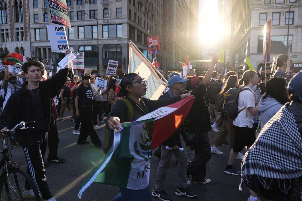 Demonstrators march at a protest opposing “Operation Midway Blitz” and the presence of ICE, Tuesday, Sept. 9, 2025, in Chicago.