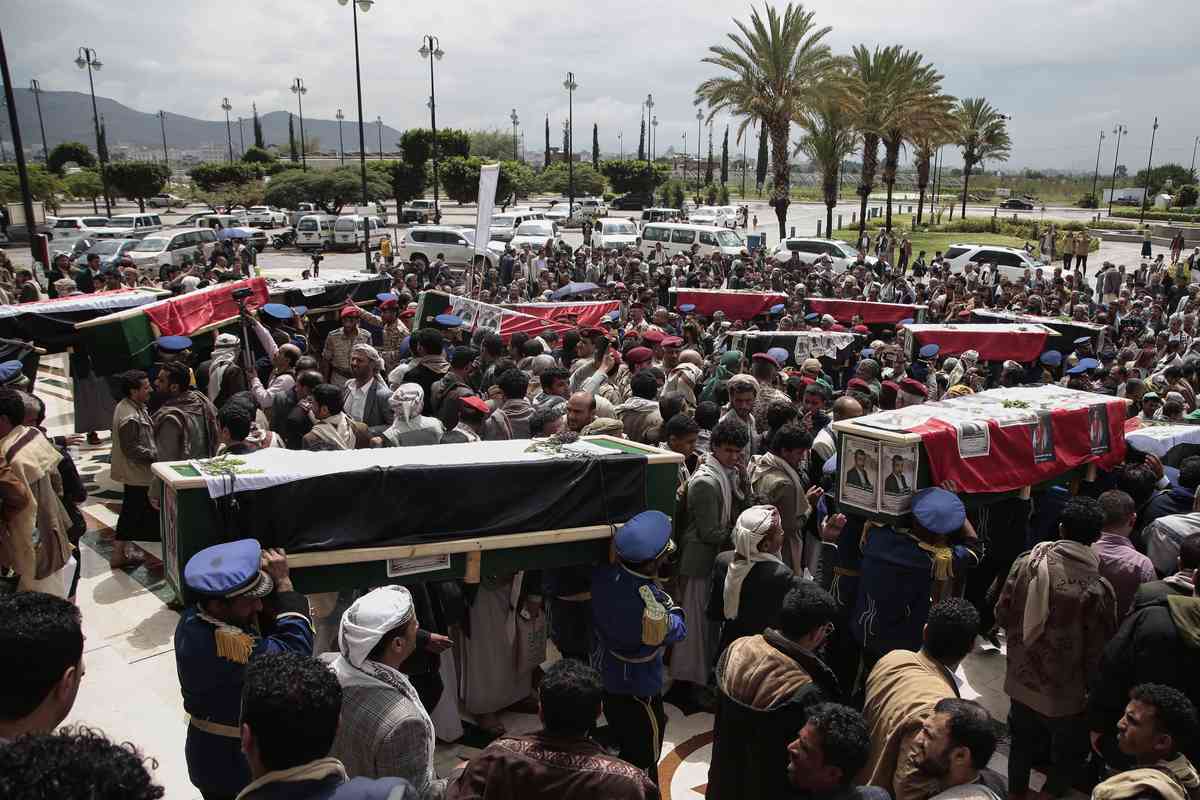 Houthi-run Al-Masirah TV broadcast the funerals Tuesday, showing dozens inside a mosque and the caskets being carried ahead of the burial. An honor guard stood beside the coffins.