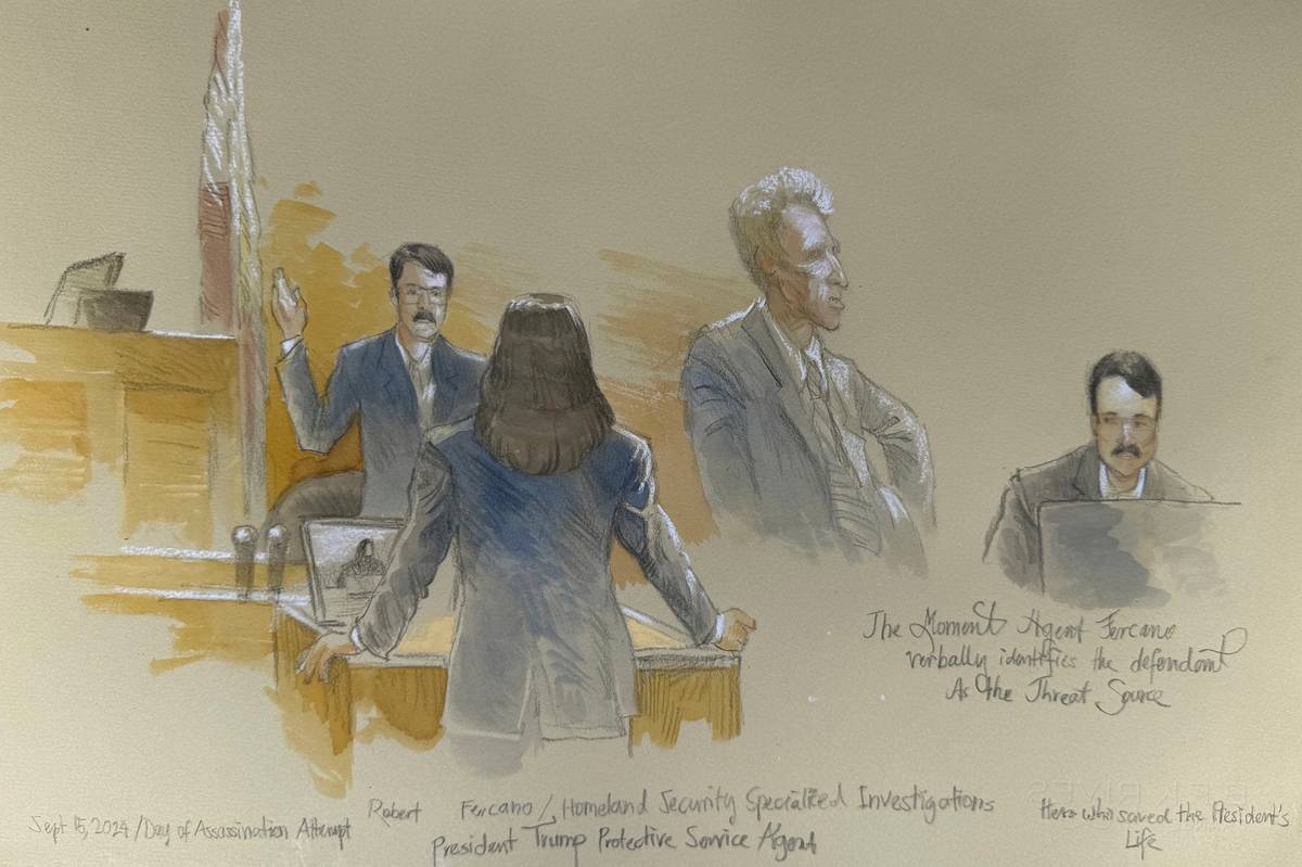 This courtroom sketch shows Secret Service agent Robert Fercano identifying the defendant in the trial of Ryan Routh, who is charged with attempting to assassinate Donald Trump last year at a golf course in South Florida, Thursday, Sept. 11, 2025, in Fort Pierce, Fla.