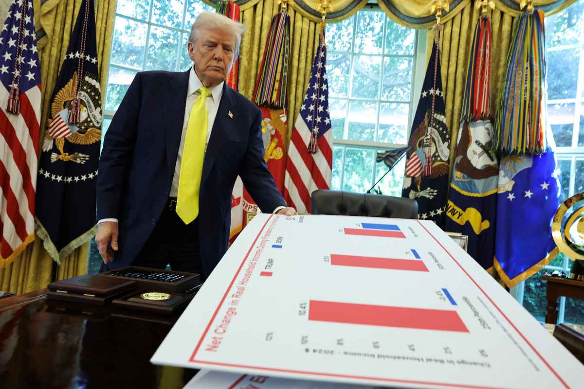 U.S. President Donald Trump holds a board, as he makes an announcement on the economy, in the Oval Office at the White House in Washington, D.C., U.S., August 7, 2025.