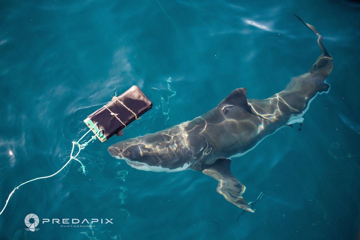 This Nov. 2019 photo provided by Predapix/Sam Cahir shows a White shark investigating testing board with bite-resistant neoprene at Neptune Island Group Marine Park in Australia.