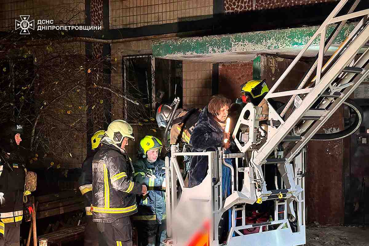 In this photo provided by the Ukrainian Emergency Service, firefighters evacuate a resident following a Russian rocket attack that hit a multi-storey apartment building in Dnipro, Ukraine, Saturday, Nov. 8, 2025.