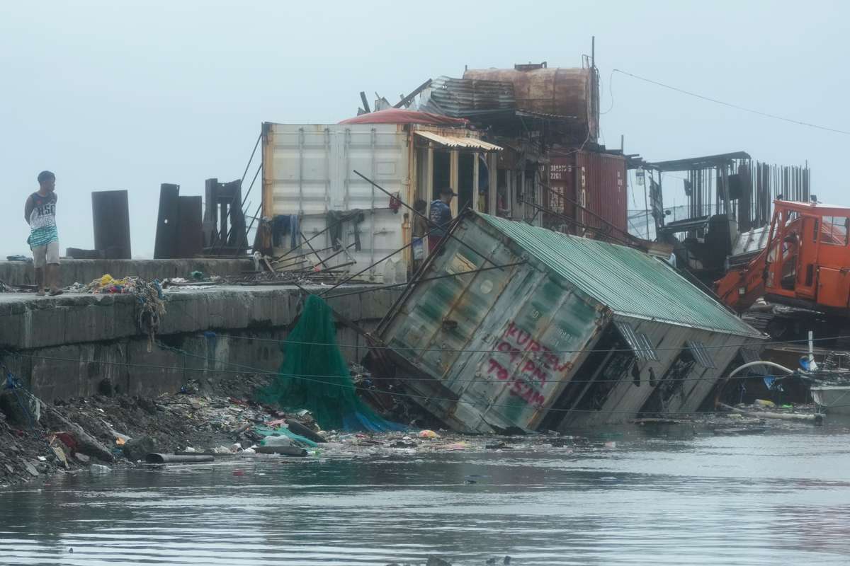 A man walks beside a container van that was toppled due to strong winds and waves caused by Typhoon Fung-wong on Monday, Nov. 10, 2025, along a coastal town in Navotas, Philippines.