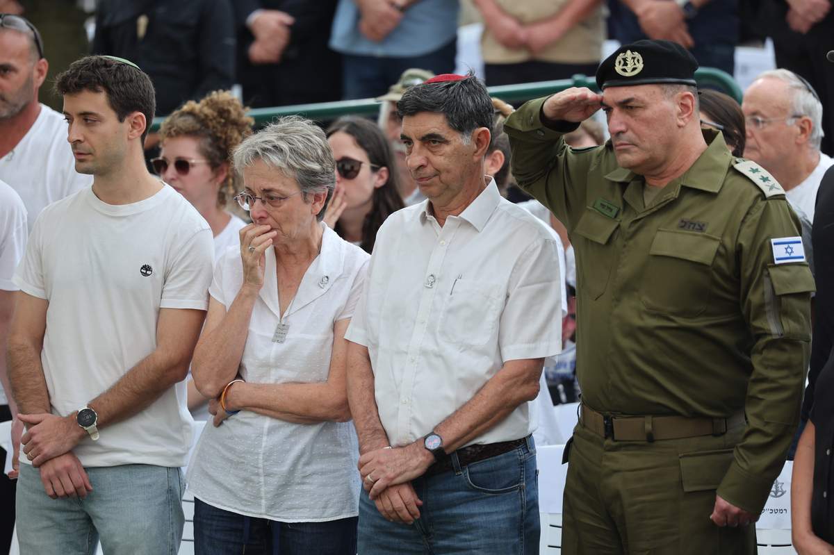 IDF chief of staff Eyal Zamir, right, with Simha Goldin and Leah Goldin, the parents and siblings of Hadar Goldin an Israeli soldier killed in Gaza in 2014 and whose body had been held there until it was released Sunday, attend his funeral in Kfar Saba, Israel, Tuesday, Nov. 11, 2025.