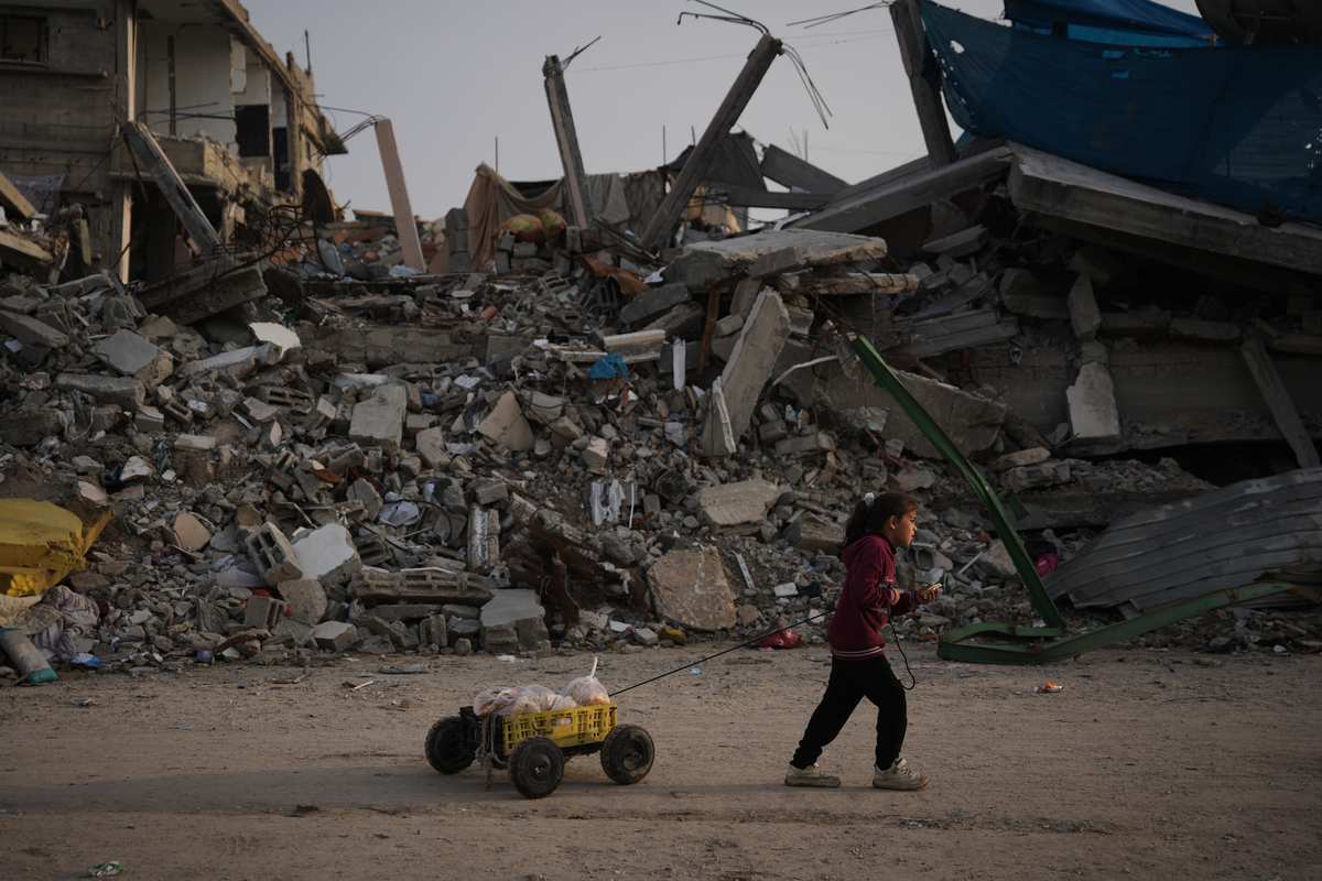 A girl carries bread as she walks past destruction left by Israeli air and ground operations in Gaza City Saturday, Nov. 29, 2025.