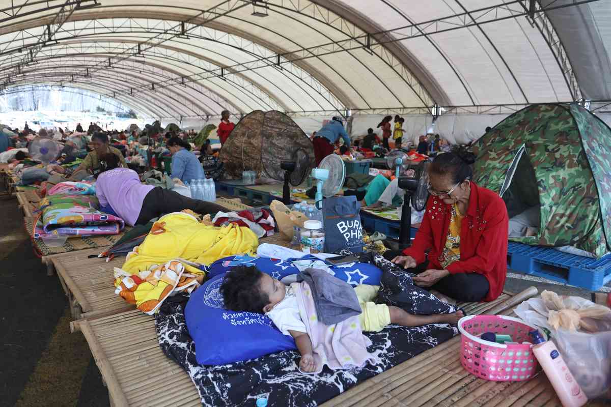 Thai residents who fled homes as Thailand and Cambodia clash over border, rest at an evacuation center in Buriram province, Thailand, Monday, Dec. 8, 2025.