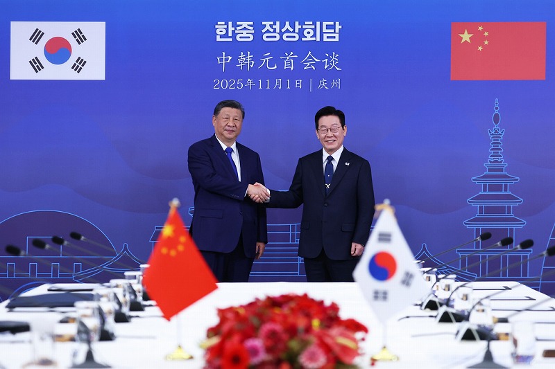 Chinese President Xi Jinping, left, shakes hands with South Korean President Lee Jae Myung before their summit meeting at the Gyeongju National Museum in Gyeongju, South Korea, on Nov. 1, 2025.