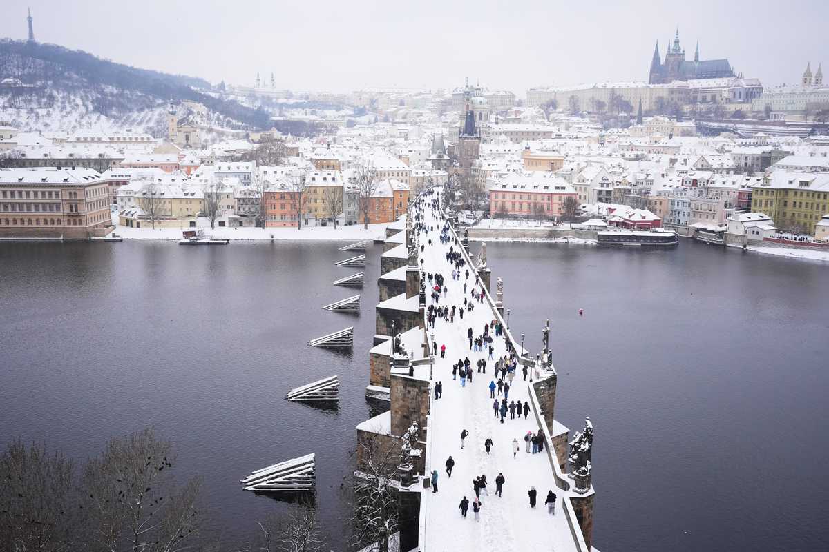 People cross the medieval Charles Bridge after a heavy snowfall in Prague, Czech Republic, Friday, Jan. 9, 2026.