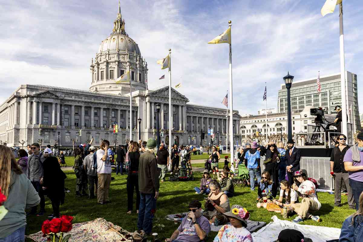 Attendees gather at Civic Center Plaza ahead of a public memorial for Grateful Dead co-founder Bob Weir in San Francisco, Saturday, Jan. 17, 2026.