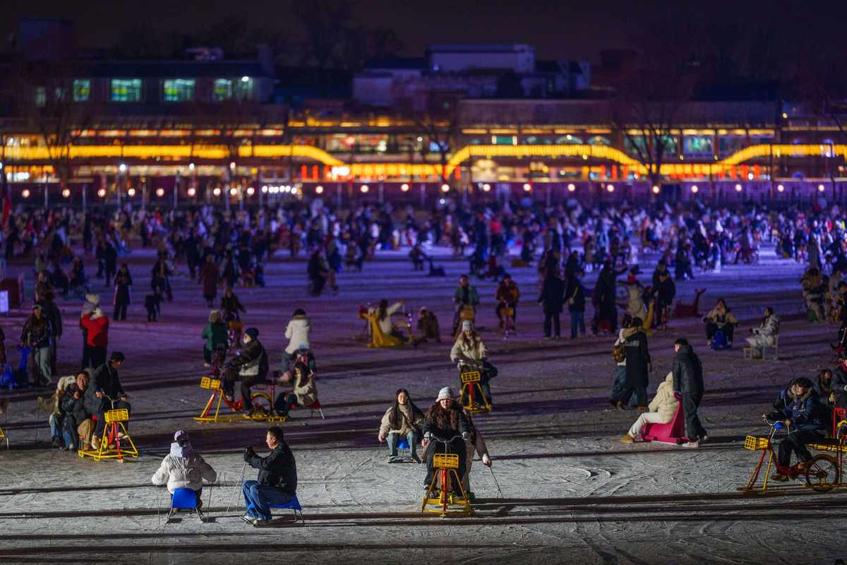 Visitors skate across a frozen lake at Shichahai in Beijing, China, Sunday, Jan. 18, 2026.