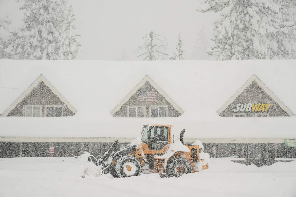 Snow is plowed in front of businesses during a snow storm Thursday, Feb. 19, 2026, in Soda Springs, Calif.