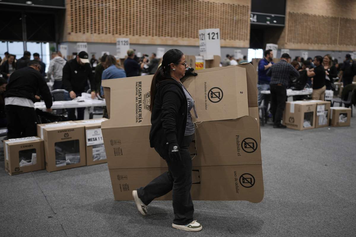 An election official dismantles a voting booth after polls closed in legislative elections in Bogota, Colombia, Sunday, March 8, 2026.