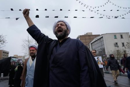 Fars News Agency via APSmoke from an explosion rises behind demonstrators attending the annual anti-...