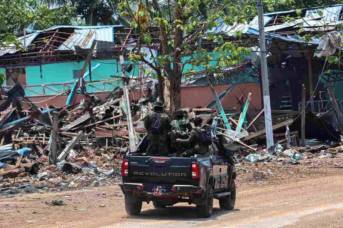 Soldiers from the Karen National Liberation Army (KNLA) patrol on a vehicle, next to an area destroyed by Myanmar’s airstrike in Myawaddy, the Thailand-Myanmar border town under the control of a coalition of rebel forces led by the Karen National Union, in Myanmar, April 15, 2024.